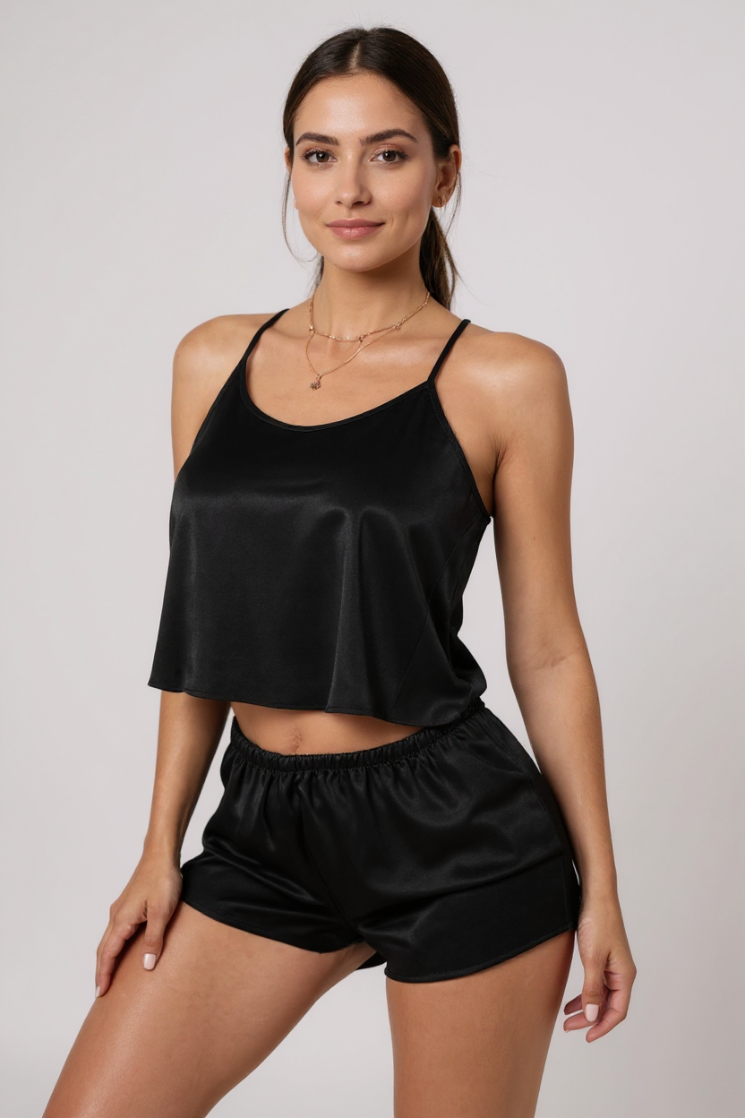 Kadın Siyah Asimetrik Sırt Dekolte Detaylı Şık Şortlu Gecelik Takım – Modern, Konforlu ve Günlük Kombinlere Uygun