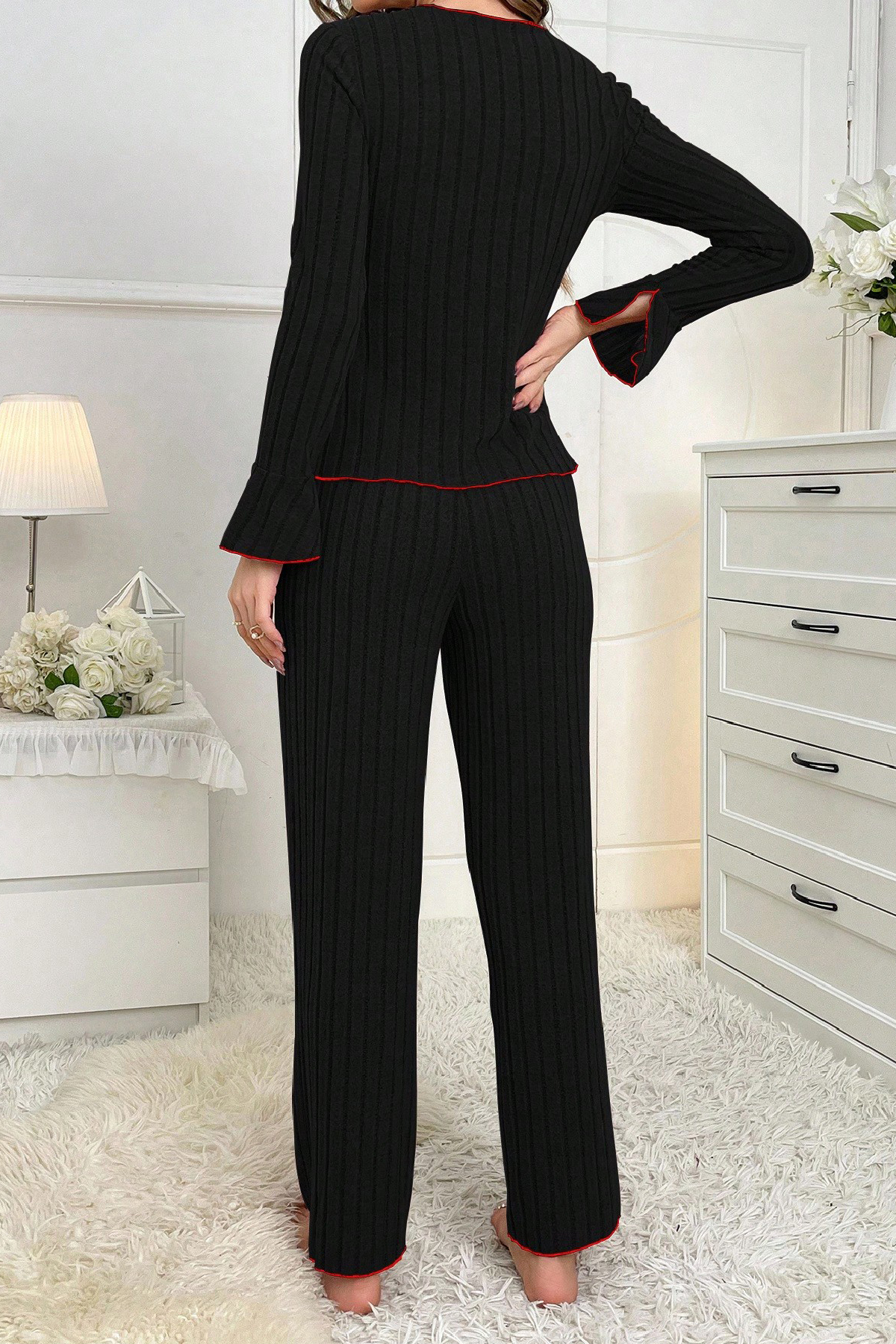 Evde rahatlığına önem verirken aynı zamanda zarif bir görünümden vazgeçmeyen kadınlar için tasarlanan bu siyah pijama takımı, yumuşak dokusu ve minimalist şıklığıyla öne çıkar. Kadın pijama takımı modelleri arasında sade tasarımıyla dikkat çeken bu model, hem evde dinlenme anlarında hem de uyku sırasında konforu ön planda tutar. Üst kısmındaki yuvarlak yaka formu ve küçük fiyonk detayı, zarif bir feminen hava katarken, fırfırlı kenar bitişleriyle tasarıma romantik bir dokunuş eklenmiştir. Uzun kollu yapısı serin akşamlarda sıcak tutar, nefes alabilen kumaş dokusu ise terletmeden yumuşacık bir his sunar. Alt parçası rahat paça kesimiyle hareket özgürlüğü sağlar; ister sabah kahvenizi yudumlarken, ister akşam dinlenme saatlerinde üzerinizden çıkarmak istemeyeceğiniz kadar konforludur. Esnek yapısı sayesinde vücudu sıkmadan doğal bir duruş sunar. Bu sade siyah pijama takımı, kadın ev giyimi kategorisinde hem şıklığı hem rahatlığı bir araya getirir. Kaliteli kumaşı ve titiz dikiş detaylarıyla uzun ömürlü kullanım vadeder. Defalarca yıkansa bile formunu ve yumuşaklığını korur. Kendinizi özel hissetmek istediğiniz her ev anında, bu iki parçalı pijama takımı size eşlik edecek. Öne çıkan özellikler: Kadın pijama takımı – iki parçalı, uzun kollu tasarım Fırfırlı kenar bitişleri ve fiyonklu zarif detay Yumuşak, esnek ve nefes alabilen kumaş dokusu Rahat kesim pantolon ile maksimum hareket özgürlüğü Ev giyimi ve uyku konforu için mükemmel seçim Sade, modern ve zamansız siyah tasarım Sonbahar ve kış aylarına uygun sıcak tutan yapı]]>